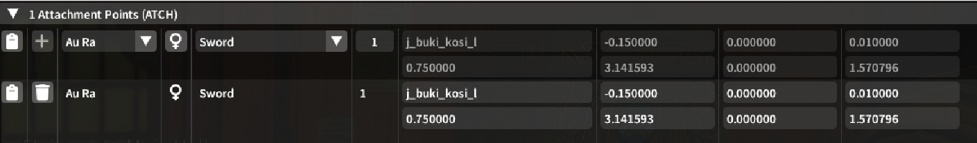 - The three numbers to the right of that are X, Y, and Z coordinates of the weapon, relative to that bone.