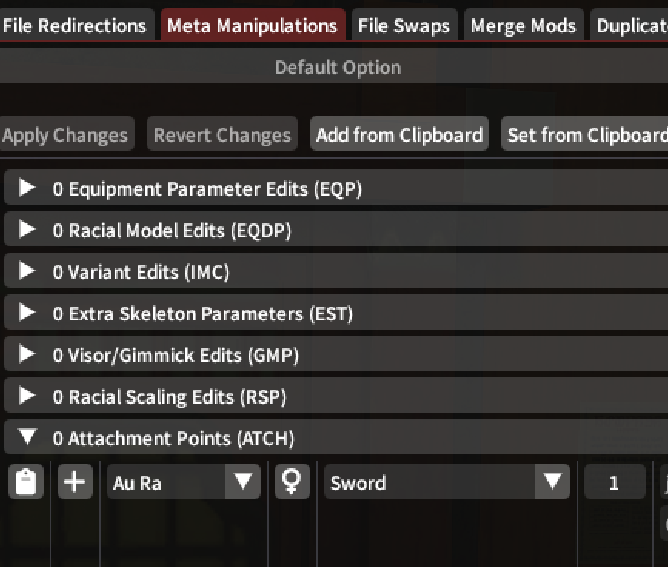 For reproduction: I'm trying to change the fem hrothgar GNB position. I saved a workspace, exported it by clicking all the fields available (as well as just the atch field or none), import it into penumbra, restarted the game 5x, enabled and disabled vfxeditor multiple times, deleted the exported .pmp file multiple times in order to ensure a full fresh re-import by Penumbra, nothing works.